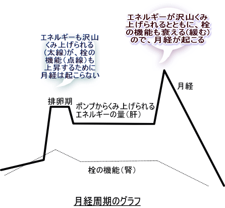 ポンプからくみ上げられるエネルギーはグラフ(太線)にもあるとおり、排卵の頃と月経前に亢進します。理由は、受精→着床→妊娠といった過程で多くのエネルギーを必要とするからです。この時、エネルギーの流れがスムーズにいかないと、それが肉体・精神両面を侵し月経前にイライラしたり、鬱っぽくなったりします。