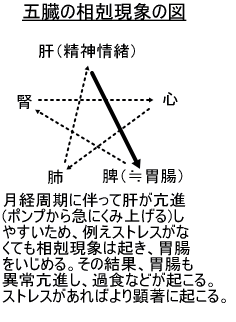 肝(ポンプからくみ上げる力)が排卵日以降、気や血の流れをコントロールできないために、イライラ・ヒステリー・胃の不調(相剋現象)などが起こります。このエネルギーを発散するためには、足を使う運動が最も手っ取り早いといえます。つまり、運動すれば滞りが解消され、スッキリする方向にいくわけです。また、気や血の滞りを解消するためには、欧米型一辺倒の食事を見直す必要がありますし、早寝して情緒を健全に保つ必要もあるでしょう。