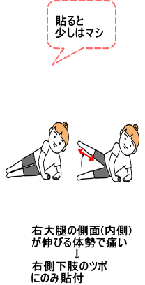 右大腿の側面(内側)が伸びる体勢で痛む→右下肢の側面(内側)が伸びる体勢で痛む→ 下半身の右側面(内側)を伸ばせない→下半身の側面(内側)を通っているエネルギーのルート(経脈)にトラブルが発生している→足の厥陰肝経→ツボは右側の 曲泉(きょくせん) 行間(こうかん)のうち、どちらか1つ。