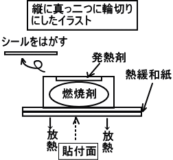 上方に貼ってあるシールをはがすと、発熱剤が熱を帯び、それが燃焼剤に移ります。温まるまでに、少々時間を要します。小型の使い捨てカイロのようなもの?(未確認)。